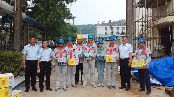 7月28日上午,公司黨委書記吳再忠、經(jīng)理孫政權(quán)、工會(huì)主席王志軍一行深入氨綸施工現(xiàn)場(chǎng)走訪慰問(wèn)一線職工,送去深切的關(guān)懷和慰問(wèn),把防暑慰問(wèn)品送到大家手中。在氨綸施工現(xiàn)場(chǎng),孫經(jīng)理同現(xiàn)場(chǎng)員工親切交談,叮囑他們?cè)诒Y|(zhì)保量完成工作任務(wù)的同時(shí)更要關(guān)心職工的身心健康。
