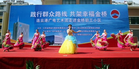 為了貫徹黨的群眾路線教育實踐活動精神,豐富基層職工的精神文化生活。6月28日上午,由連云港廣電傳媒集團和集團公司共同主辦的“踐行群眾路線,共架幸福金橋”連云港廣電藝術團走進鹽場職工小區(qū)文藝演出在猴嘴昌圩湖社區(qū)拉開帷幕。廣電傳媒集團領導戴詠寒、馬富勝、萬自力,集團公司領導顧永庚、鄭宜虎、戴鴻鳴與數(shù)百名鹽場職工群眾歡聚昌圩,共同欣賞來自連云港廣電新聞綜合頻道的主持人和編輯記者與金橋職工自編自演的精彩節(jié)目。