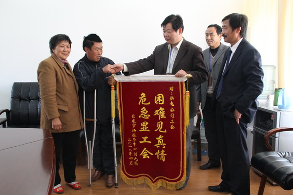 4月28日,巨龍農(nóng)貿(mào)市場(chǎng)特困職工劉元國拄著雙拐,在妻子陪伴下來公司送上錦旗,感謝干部職工的愛心捐助。去年初,下崗后在外謀生的劉元國因討要欠款發(fā)生車禍,腰部、腿部嚴(yán)重骨折,花費(fèi)10萬余元,全家借錢度日。為讓劉家生活得到改善,春節(jié)前全公司發(fā)起獻(xiàn)愛心活動(dòng),共為劉元國募集錢款萬余元。(司宣)