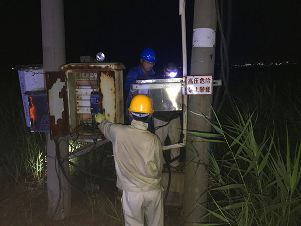 7月30日晚,臺(tái)南供電所員工在蒿西養(yǎng)殖區(qū)緊急處理由于過(guò)負(fù)荷導(dǎo)致的配電箱電表線路故障。入伏以來(lái),連云港氣溫居高不下,電網(wǎng)負(fù)荷持續(xù)走高,7月30日晚21點(diǎn),由于用電負(fù)荷突增,蒿西養(yǎng)殖區(qū)發(fā)生配電箱電表線路故障,接到報(bào)修電話后,該所值班工作人員迅速備件,冒著高溫、悶濕的條件下進(jìn)行緊急搶修。圖為工作人員正在安裝配電箱電表接線。此次新招2名實(shí)習(xí)員工也參加了該項(xiàng)搶修任務(wù)。截止當(dāng)晚11時(shí)蒿西養(yǎng)殖區(qū)及其周邊已送電成功。