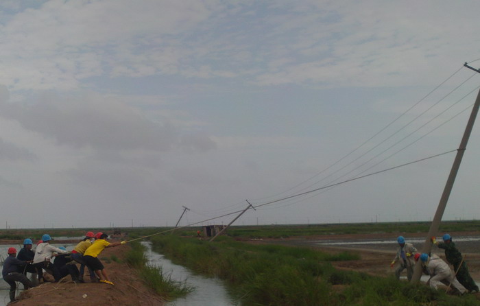 8月3日天剛亮,大家都顧不上休息,立即分片趕到受災(zāi)現(xiàn)場巡視情況。東港工區(qū)洋井口8根高壓桿被刮倒,大瑞頭圩、二圩、新灘口和方南、嚴(yán)港等工區(qū)30多根低壓桿被刮歪,有的倒在了格堰上,情況十分危急。搶修人員立即作了停電應(yīng)急處理,確保安全。
