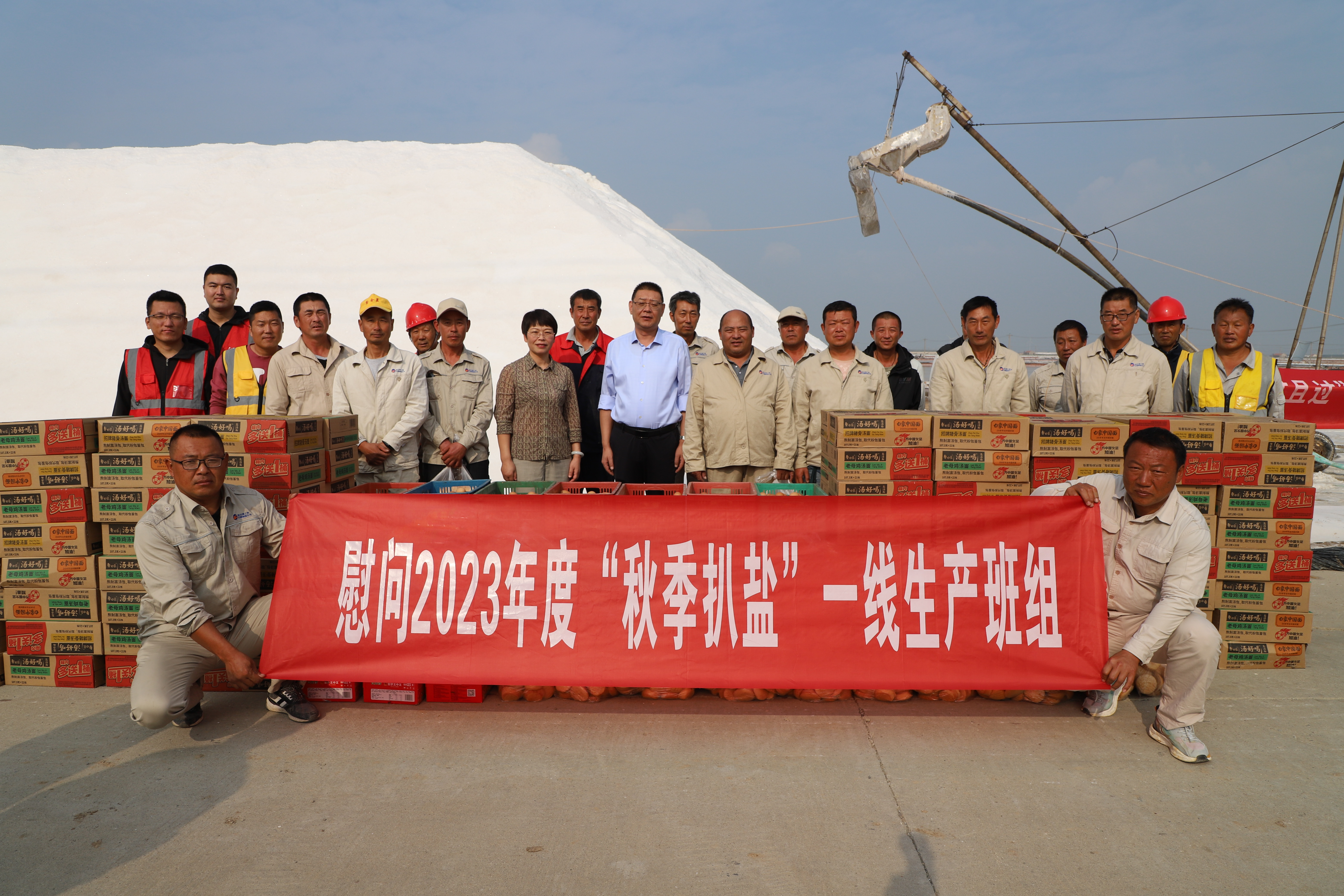 收獲的季節(jié),秋高氣爽的天氣、堆垛成廩的鹽粒、曬得黝黑的面龐,組成了鹽場灘頭鹽工們大干的場景。10月13日上午,灌西投資公司黨委書記、董事長孫政權(quán)與黨委副書記、工會主席王宏;總經(jīng)理吳衛(wèi)平與常務(wù)副總經(jīng)理徐一林分別帶隊深入日曬制鹽秋收鹽現(xiàn)場,看望慰問奮戰(zhàn)在一線的扒鹽員工,鼓勵他們在做好自身防護的同時再接再厲,為今年的原鹽豐收再立新功。