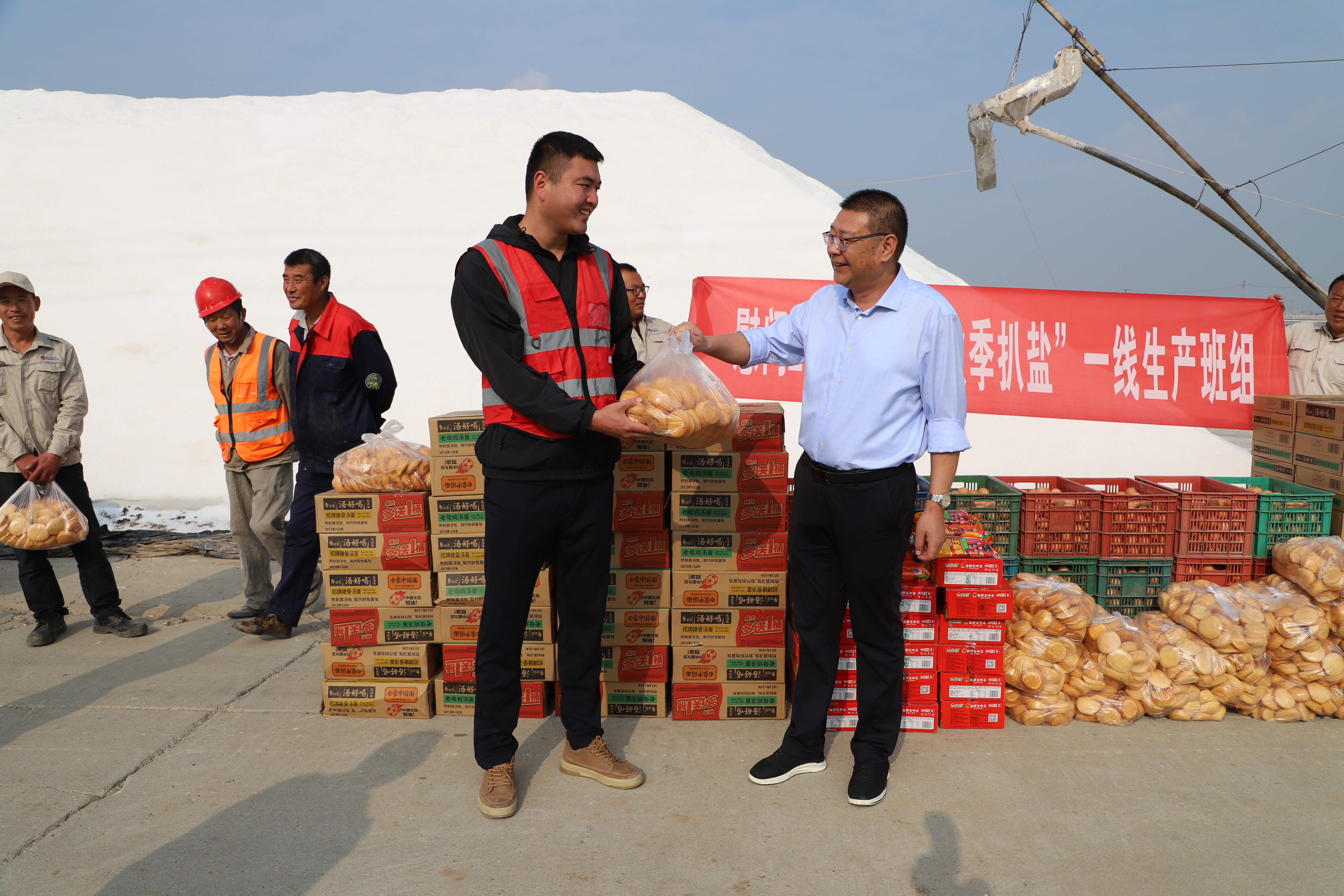 “你們辛苦了,我代表公司來看望大家?!痹谛潞游灏?,孫政權(quán)與扒鹽現(xiàn)場職工握手問好,感謝他們?yōu)槿諘裰汽}公司的原鹽生產(chǎn)所付出的辛勤努力,叮囑他們要落實落細(xì)扒鹽安全生產(chǎn)措施,并送上雞蛋、方便面、火腿腸、雞蛋糕等物品。