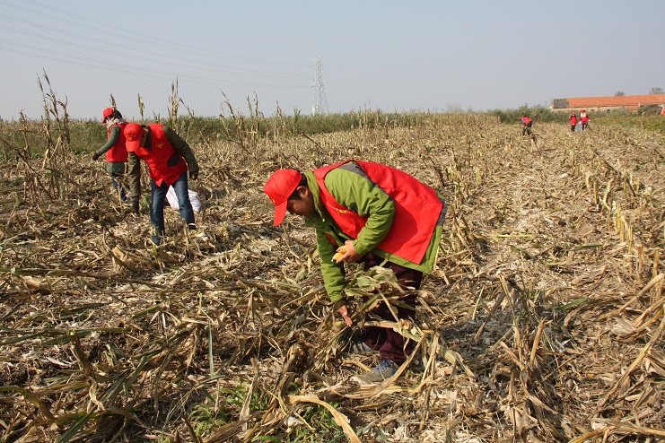 11月4日,灌西實業(yè)公司柴門居民點農(nóng)田內(nèi)出現(xiàn)了一批特殊的“農(nóng)民”,他們身穿紅馬甲、頭戴小紅帽,正低頭彎腰的在農(nóng)田里搜尋著散落的玉米。
