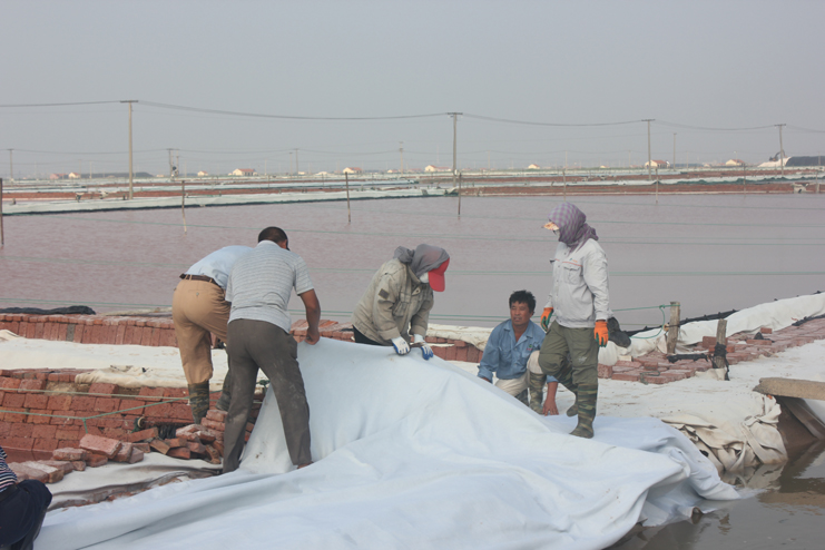 隨后我們又來到了新河制鹽分公司十四班的裝鹽現(xiàn)場。一位工人操作著挖掘機,往卡車上裝鹽銷售,如今裝鹽實現(xiàn)了機械化,工人的勞動負荷也減輕了許多。在埒南制鹽分公司的五班,我們看到七八個工人正在灘頭更換土工布,他們一字排開,先將土工布鋪開,然后分工合作,有的人負責把布理齊鋪平,有的則把磚頭鋪放在布上用來固化。