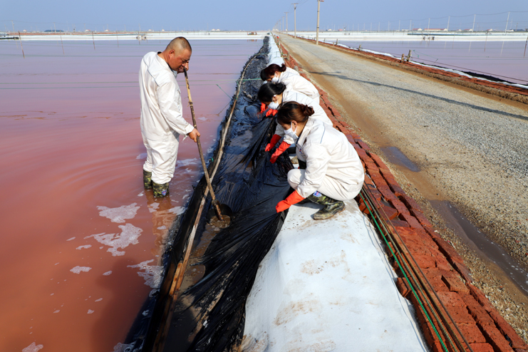 趁著休息的間隙,筆者與身邊忙得滿頭大汗的8班班長祝星星聊了起來。據(jù)祝星星介紹,每天員工4點半就到灘頭,進行鹽池的人工活碴、稟基修復、鹽池鹵水補充、收放設備檢查等一系列工作,因此,合理安排工作量非常重要。他告訴筆者,室外工作工人的勞保服比較厚,一天下來工作服濕了又干,干了又濕,衣服上都泛出厚厚的鹽漬。一天下來,全班要消耗2大桶甚至更多的飲用水。現(xiàn)在公司里對我們一線生產(chǎn)崗位員工非常關心,防暑降溫工作非常到位。最近,單位又為我們發(fā)放高溫津貼、電風扇、防暑降溫藥品。這些讓我們員工真切感受到組織的力量,組織得偉大,所以雖說現(xiàn)在比平時更辛苦,我們有信心戰(zhàn)高溫、奪高產(chǎn)。