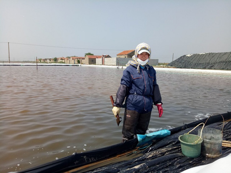 實業(yè)公司制鹽分公司廣大員積極推進海鹽基地建設(shè),最近利用有利天時、高蒸發(fā)量搶制鹵水,起早貪黑忙著走水制鹵,整理塑灘。二班女工皮晶晶工作勤懇認真,正忙著在塑池內(nèi)裝塑布,釘壓條,她是海鹽基地上一朵美麗的“鹽花”。(史祥燕)