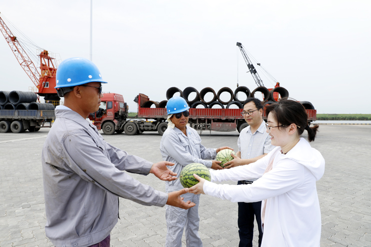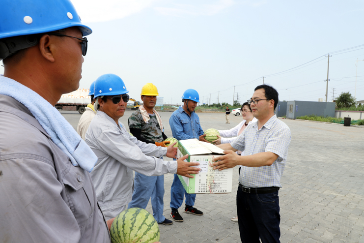入伏以來,氣溫持續(xù)攀升,五灌河碼頭裝卸工作也迎來了夏季高溫的“烤驗”。為做好高溫酷暑期間的防暑降溫工作,確保職工工作安全和身心健康,7月25日,灌西工會一行到宵洋五灌河碼頭為堅守在崗位上奮戰(zhàn)的碼頭工人送去關懷和問候。 高溫籠罩下的碼頭暑氣蒸騰,灌西工會為碼頭工人送來了西瓜、白糖、綠豆、藥品等防暑降溫物品。并叮囑職工們要注意安全生產(chǎn),做好防暑降溫工作。(張明建)