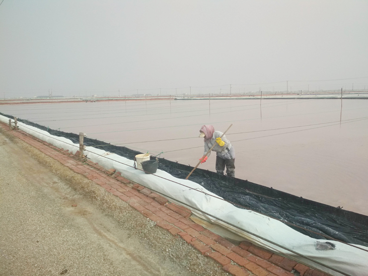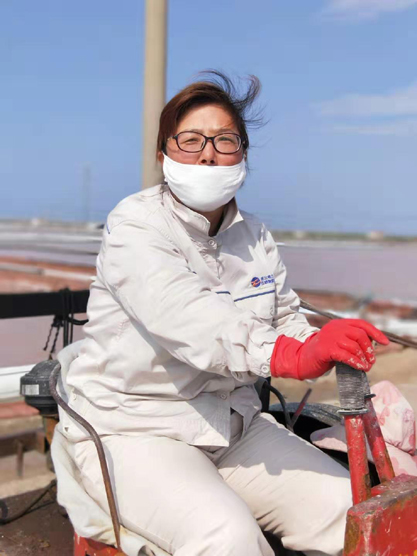 每一個女孩都喜歡美麗的衣服,都喜歡把自己裝扮得漂亮迷人。可是工作的特殊性不允許鹽灘工“貌美如花”。周娟,37歲,新河制鹽分公司5班一名普通的女工,她關(guān)注班組集體事務(wù),能夠團結(jié)、關(guān)心班組女工,并積極帶領(lǐng)女職工昂揚向上,奮發(fā)有為,為單位鹽業(yè)生產(chǎn)多作貢獻。周娟特別注重對新上崗的員工培訓(xùn)教育工作,她總是不厭其煩講解原鹽操作流程及工作中的注意事項和安全隱患,毫不保留將自己多年的經(jīng)驗傳授給大家。炎熱的夏天,當(dāng)大家坐在辦公室,吹著空調(diào)、喝著冰水時,她和她的同事依舊在鹽灘忙碌著,嬌嫩的皮膚被曬得黝黑。盡管如此,她依然每天駕駛著活茬機,一遍又一遍地游走在鹽田,將汗水撒在工投。