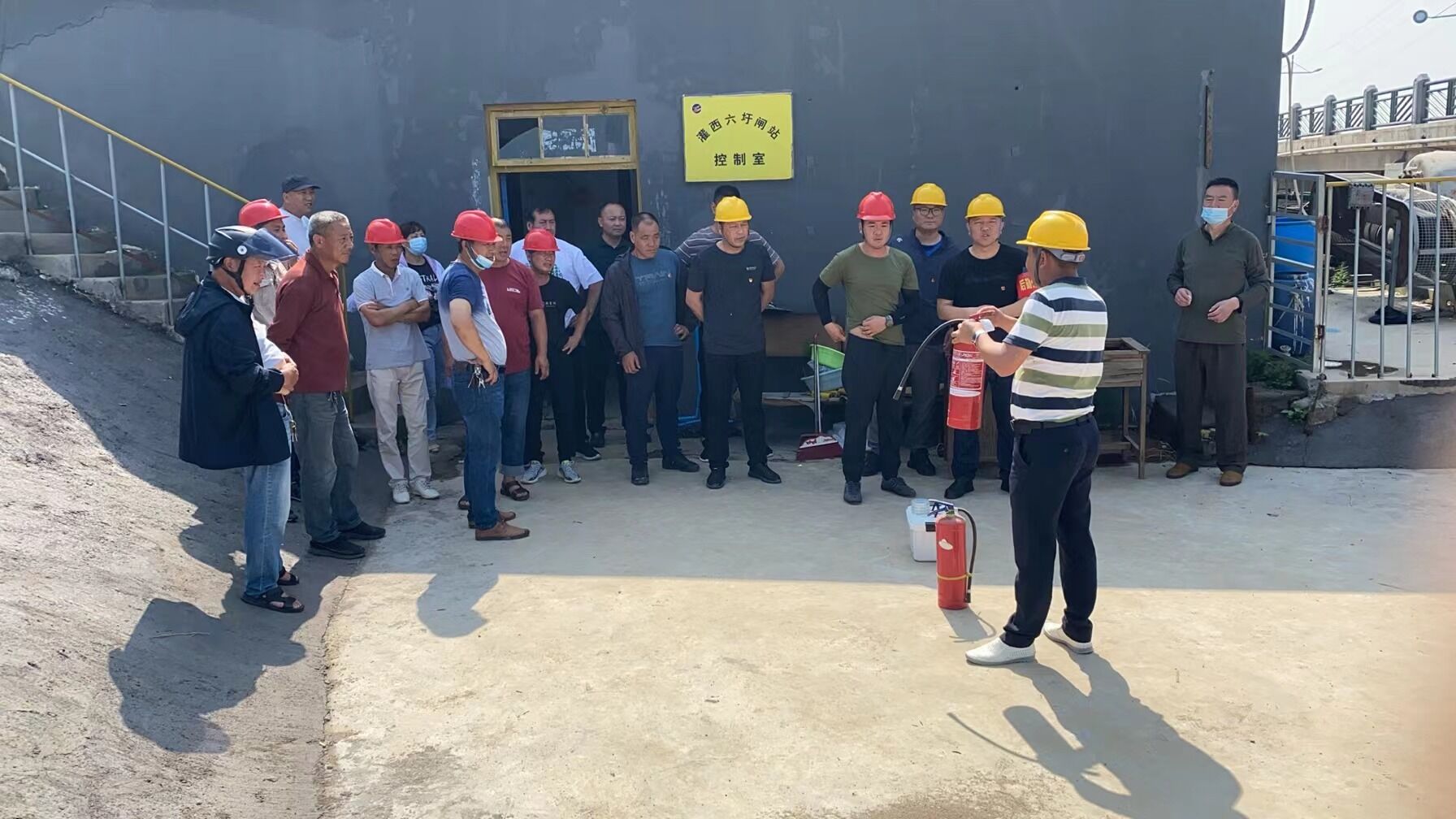 現(xiàn)場總指揮由經(jīng)理江德全擔任,副總指揮由分管安全經(jīng)理孫曉波擔任,滅火人員為六圩閘班組人員和其他閘站班組人員。分管安全領導負責主持、組織全單位人員按火災事故“應急預案”的要求進行模擬演練。這次模擬演練以2022年6月的某一天,班組生產(chǎn)現(xiàn)場因設備或線路短路等不明原因?qū)е履吃O備突然冒煙,進而起火燃燒,并且火勢迅速蔓延擴大。在大家齊心協(xié)力的撲救行動中,火勢慢慢變小,最后熄滅。事后,責令相關責任人寫出書面報告,必須以最快的方式逐級上報,如實匯報,不得隱瞞。