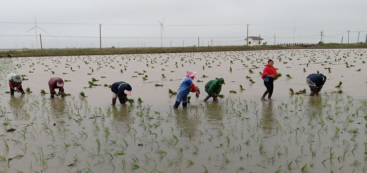 連日來(lái),工人們克服天氣炎熱等因素,搶時(shí)間趕進(jìn)度。在明威公司稻田里隨處可見(jiàn)一片繁忙景象:拔秧的,捆秧的,插秧的,她們按照勻、整、齊的標(biāo)準(zhǔn),不一會(huì)兒,一排排秧苗整齊地立在了水田中,構(gòu)成一幅美麗的田園畫(huà)卷。