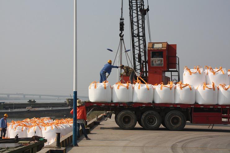 4月30日上午9時(shí)許,隨著一聲汽車長笛,一輛載有近40噸化工物資的卡車徐徐??吭谙笪锪鞴疚骞嗪哟a頭邊,緊接著碼頭鐵臂起舞,機(jī)械操作工嫻熟地操縱著塔吊機(jī)械,準(zhǔn)確地將一包包噸貸物資裝卸在碼頭邊的貨船中。。。。。。自此,一輛輛滿載40余噸貨物的卡車源源不斷向碼頭駛來。