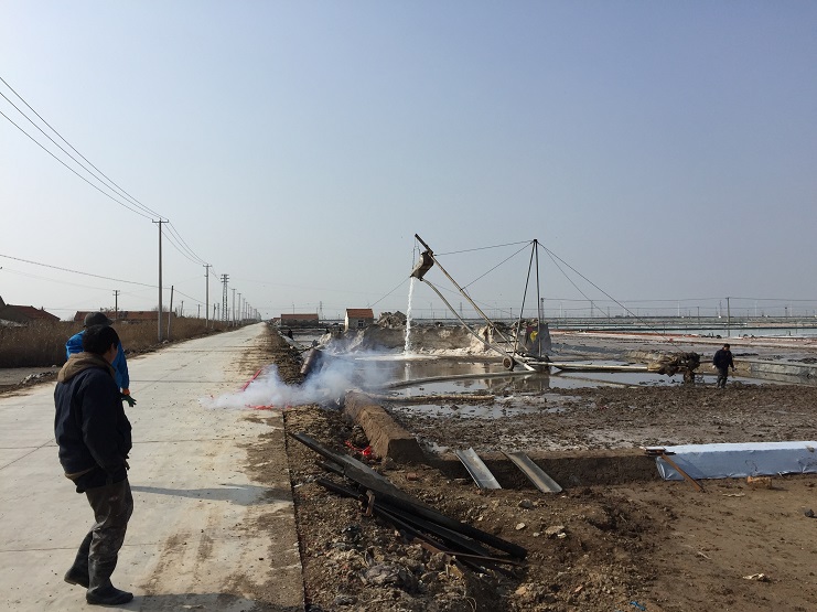 2月25日上午九點(diǎn)十八分,伴隨著鞭炮聲清脆響起,新河制鹽分公司五班二號(hào)扒鹽機(jī)組輸鹽大架銀瀑飛濺,拉開(kāi)了新河制鹽春季扒鹽的序幕。