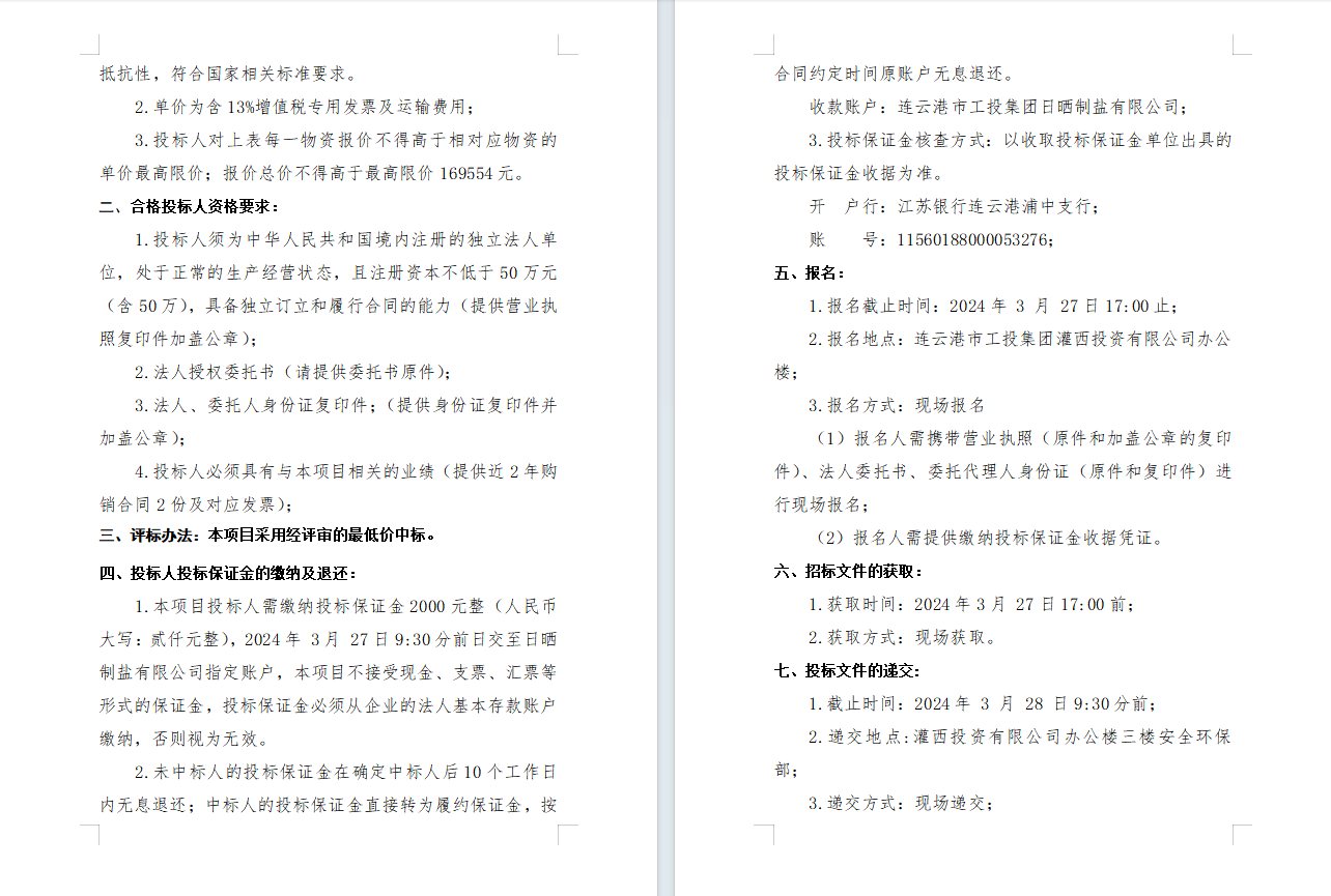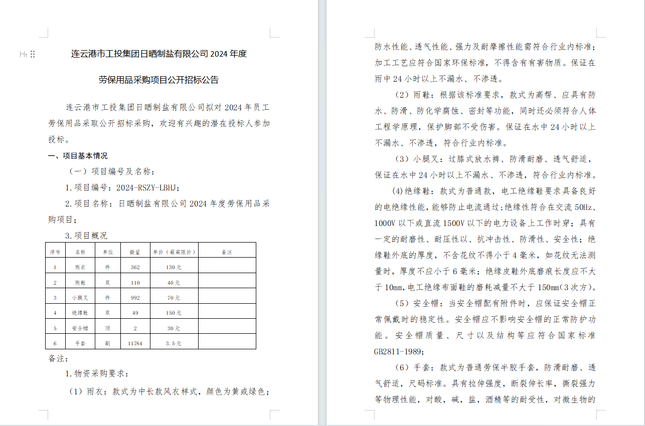 連云港市工投集團日曬制鹽有限公司2024年度勞保用品采購項目公開招標公告
