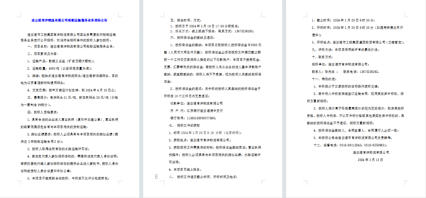連云港宵洋物流有限公司船舶運輸服務(wù)業(yè)務(wù)招標(biāo)公告