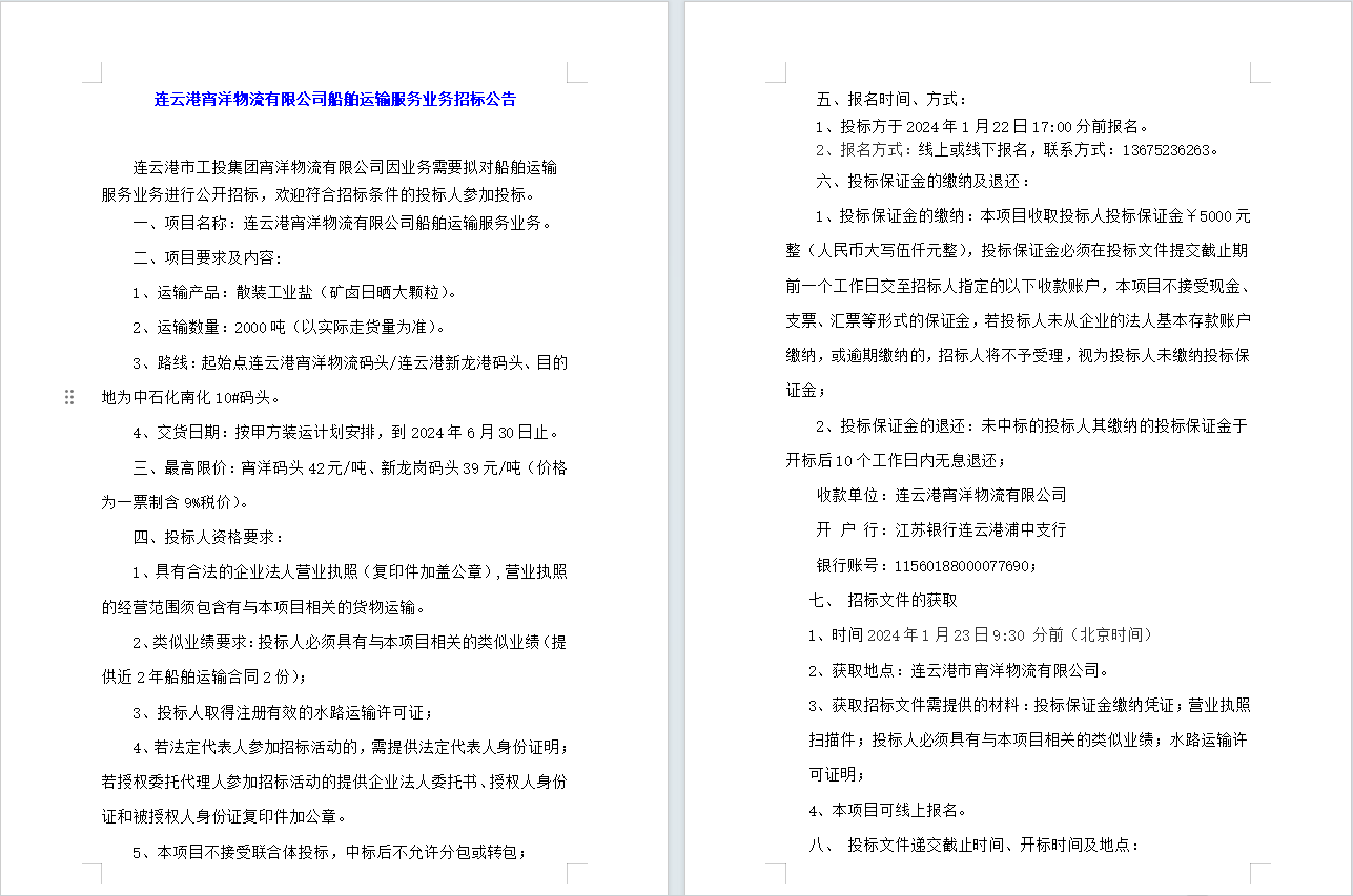 連云港宵洋物流有限公司船舶運輸服務(wù)業(yè)務(wù)招標(biāo)公告