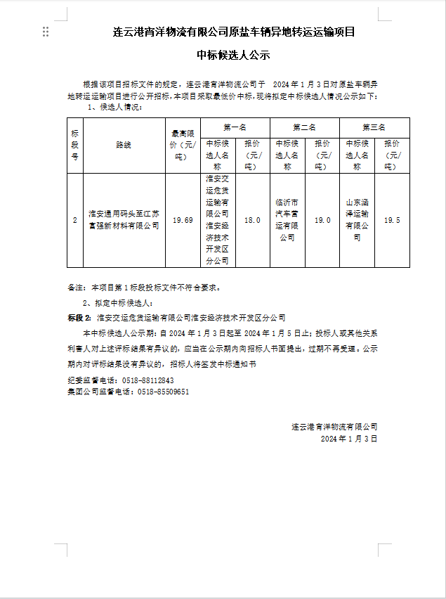 連云港宵洋物流有限公司原鹽車輛異地轉(zhuǎn)運(yùn)運(yùn)輸項目中標(biāo)候選人公示