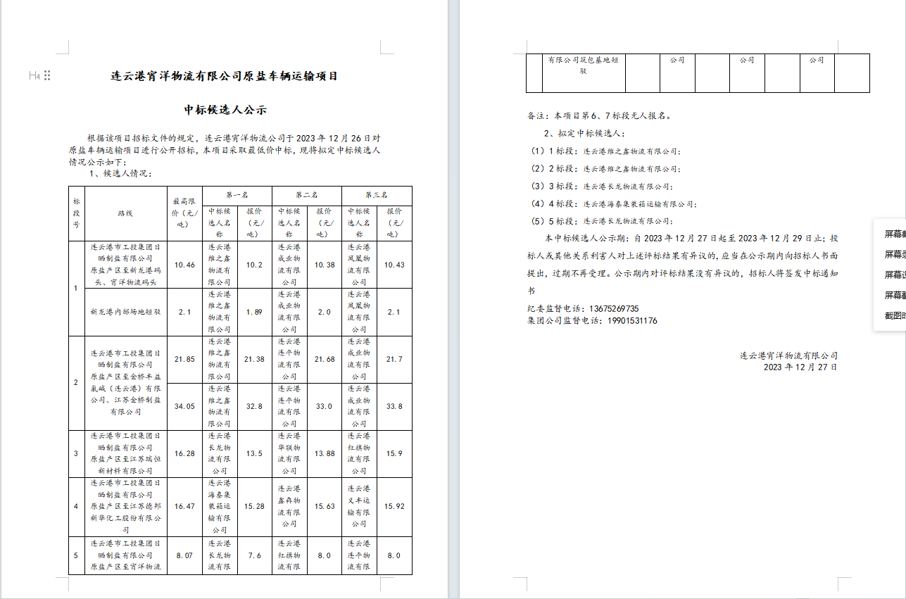 連云港宵洋物流有限公司原鹽車輛運輸項目中標(biāo)候選人公示