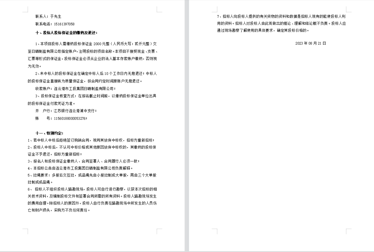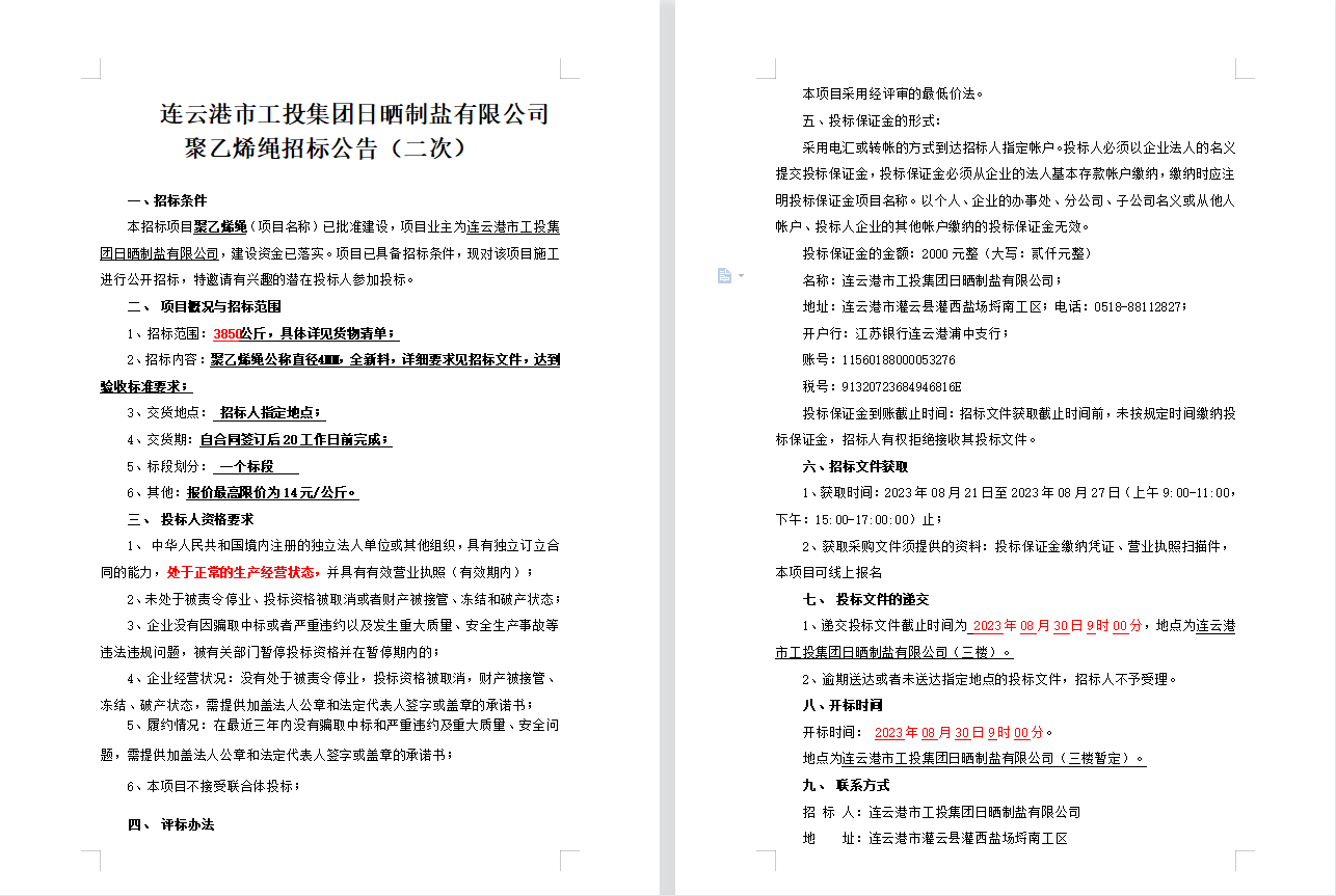 連云港市工投集團日曬制鹽有限公司聚乙烯繩招標(biāo)公告(二次)
