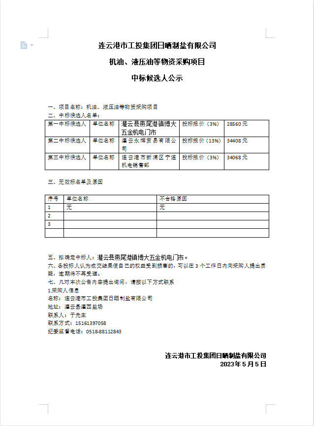 連云港市工投集團(tuán)日曬制鹽有限公司機(jī)油、液壓油等物資采購項(xiàng)目中標(biāo)候選人公示