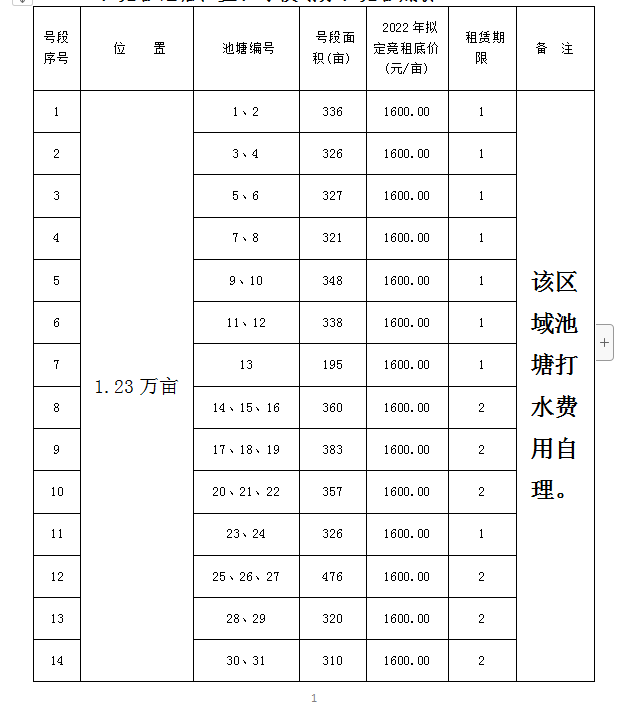 一、競租池塘位置、號段劃分、競租底價(jià)
