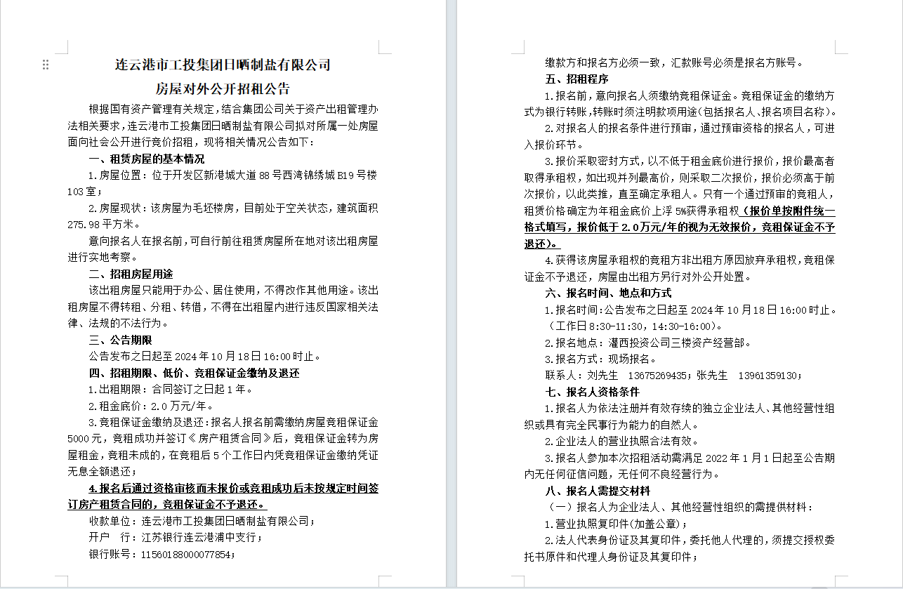 連云港市工投集團(tuán)日曬制鹽有限公司 房屋對(duì)外公開招租公告