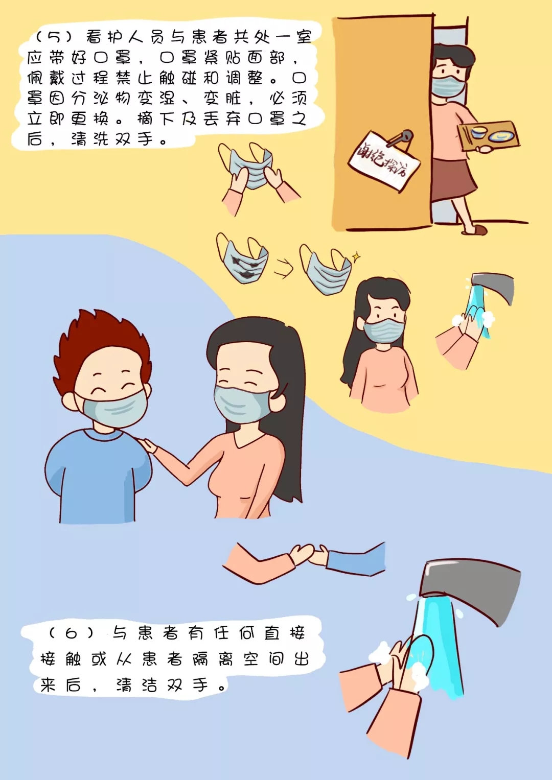 (5)看護(hù)人員與患者共處一室應(yīng)帶好口罩,口罩緊貼面部,佩戴過程禁止觸碰和調(diào)整??谡忠蚍置谖镒儩?、變臟,必須立即更換。摘下及丟棄口罩之后,清洗雙手。