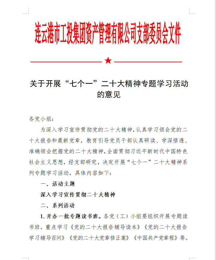 為在金融板塊快速掀起學(xué)習(xí)宣貫黨的二十大精神熱潮,支部精心組織、積極籌劃,完善學(xué)習(xí)方案,創(chuàng)新學(xué)習(xí)教育形式,豐富黨建活動載體,支部結(jié)合公司實(shí)際,專門制定《學(xué)習(xí)宣傳貫徹二十大精神學(xué)習(xí)方案》、《關(guān)于開展“七個(gè)一”二十大精神專題學(xué)習(xí)活動的意見》。