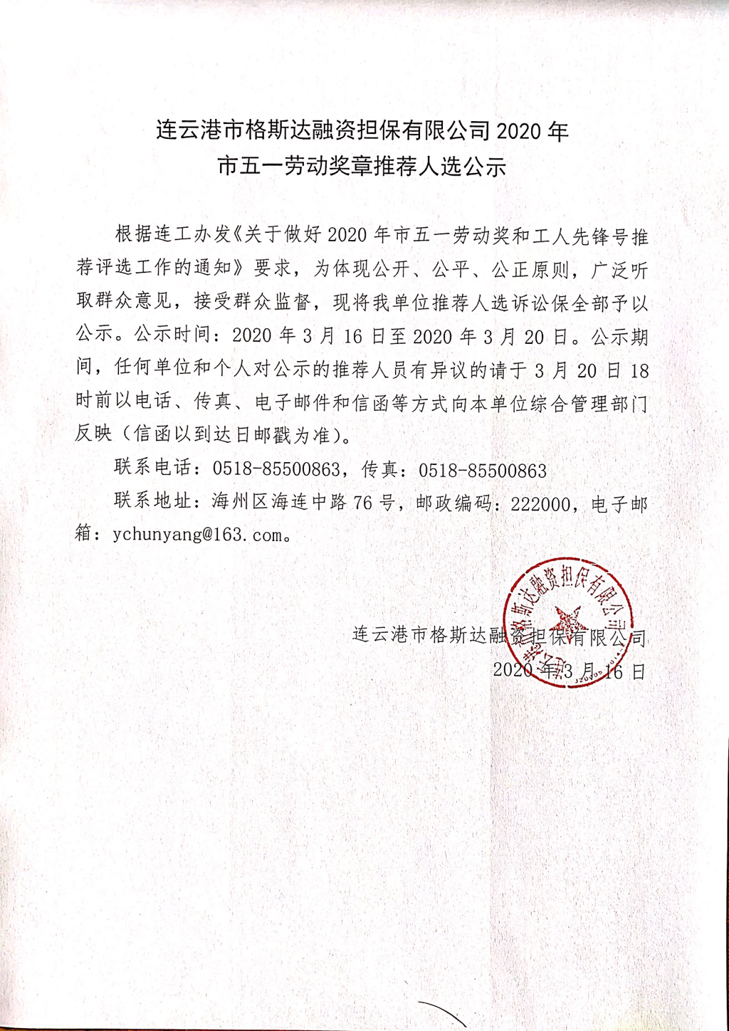 連云港市格斯達(dá)融資擔(dān)保有限公司2020年市五一勞動(dòng)獎(jiǎng)?wù)峦扑]人選公示