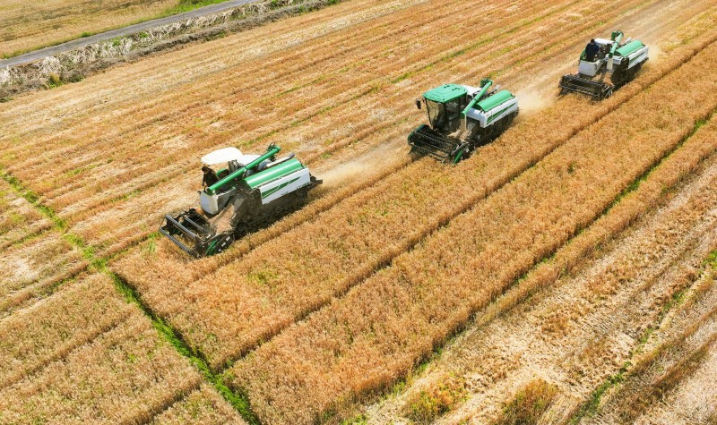 6月8日,在青口投資公司大新農(nóng)場鹽堿地種植區(qū),小麥一片金黃,麥穗顆粒飽滿,收割機在麥田里來回穿梭加緊搶收小麥。