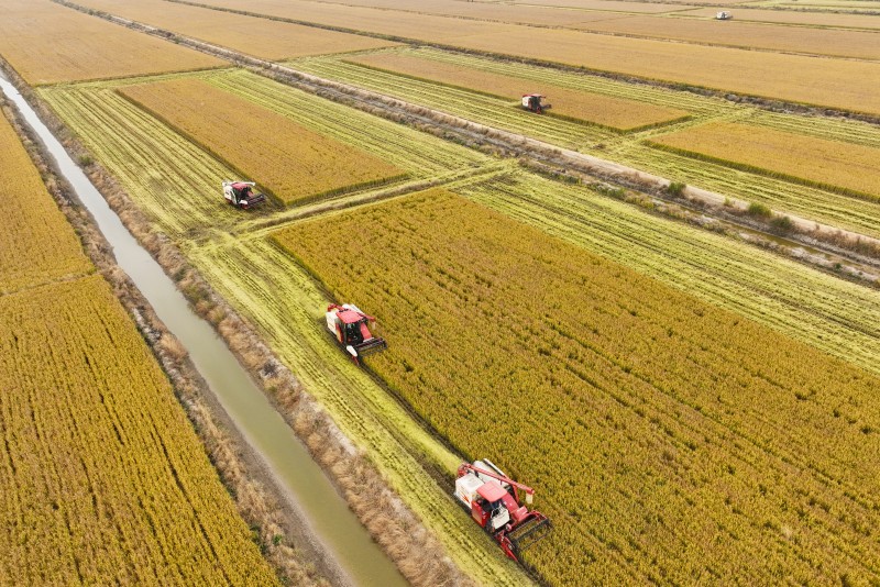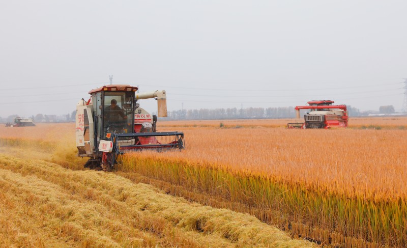 ? ? ? ?稻田里,收割機(jī)正馬力全開(kāi),不斷在田間穿梭,所到之處一排排水稻被整齊地收割下來(lái),割稻、脫粒、吐稈一氣呵成,空氣中彌漫著稻谷清香。