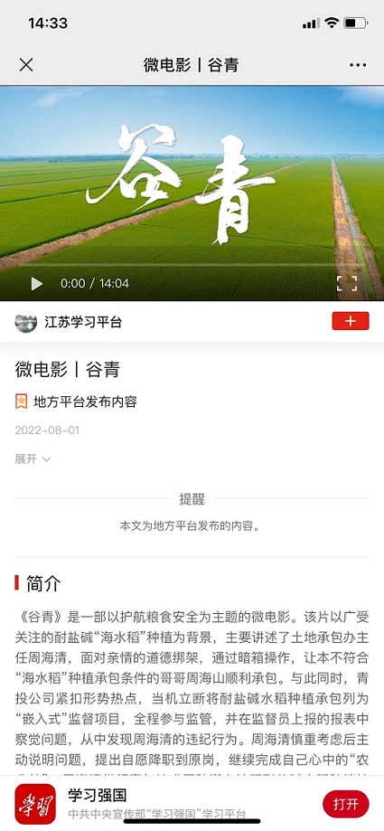 近日,由連云港市工投集團青口投資公司自編自演的微電影《谷青》入選學習強國---江蘇學習平臺。
