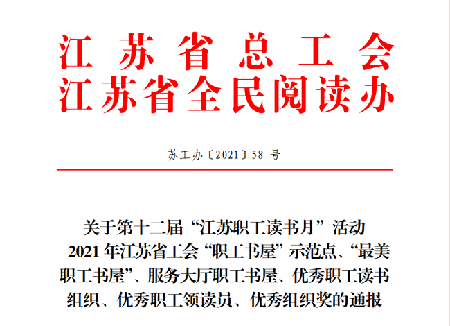 近日,江蘇省總工會(huì)、江蘇省全民閱讀辦聯(lián)合下發(fā)《關(guān)于第十二屆“江蘇職工讀書(shū)月”活動(dòng)通報(bào)》(蘇工辦【2021】58號(hào))文中,我公司職工書(shū)屋獲評(píng)2021年度江蘇省工會(huì)“職工書(shū)屋”示范點(diǎn),同時(shí)獲贈(zèng)圖書(shū)近200冊(cè)。