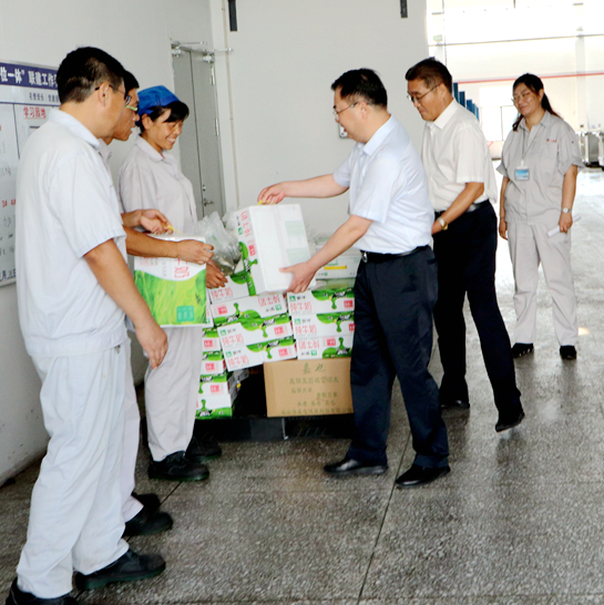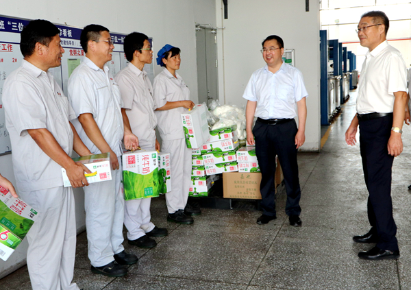 8月1日上午,集團(tuán)公司黨委副書記戴鴻鳴、工會(huì)主席劉承志來我公司慰問生產(chǎn)一線員工,為辛勤工作的員工送來牛奶、綠豆等防暑降溫慰問品。公司黨支部書記、副董事長鄒德兵,總經(jīng)理韓立新等多位領(lǐng)導(dǎo)陪同。