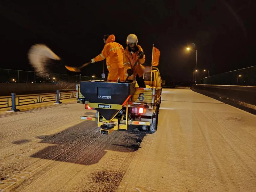 受寒潮影響,2月20日下午,港城普降“冰雪+冰?!?,投資公司第一時(shí)間啟動(dòng)惡劣天氣應(yīng)急處置預(yù)案,道路保潔、市政養(yǎng)護(hù)、后勤保障等戰(zhàn)線的干部職工以雪為令,在重點(diǎn)區(qū)域、重點(diǎn)路段、坡道、橋梁、涵洞等結(jié)冰路段進(jìn)行撒鹽融雪融冰作業(yè),全力以赴除冰雪、防事故、護(hù)平安,為市民群眾出行一路“護(hù)航”。