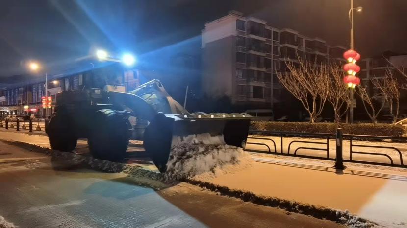當(dāng)晚,按照“即下即清、先通后凈、保障通行”的清雪除冰原則,在統(tǒng)一調(diào)度下,一臺臺清雪設(shè)備有序穿行于道路上,撒布機(jī)打頭陣,推雪板車緊隨其后,將路面積雪進(jìn)行打通,地上的雪從前向后逐次被清雪車輛推向道路邊緣。隨后,由人工加以配合,在人機(jī)結(jié)合方式下,冰雪被裝到車上清運(yùn)走。