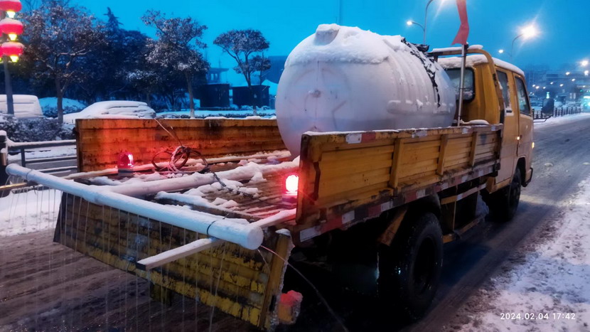 ? ? ? ? 今天(2月4日),港城普降暴雪,臺(tái)北華茂全員出動(dòng)500余人次,大小機(jī)械100余臺(tái)(班),全力確保了轄區(qū)交通線暢通。這中間,出現(xiàn)一臺(tái)除雪“核武器”,這就是翔立分公司自制的鈣液噴淋除雪車(chē)。
