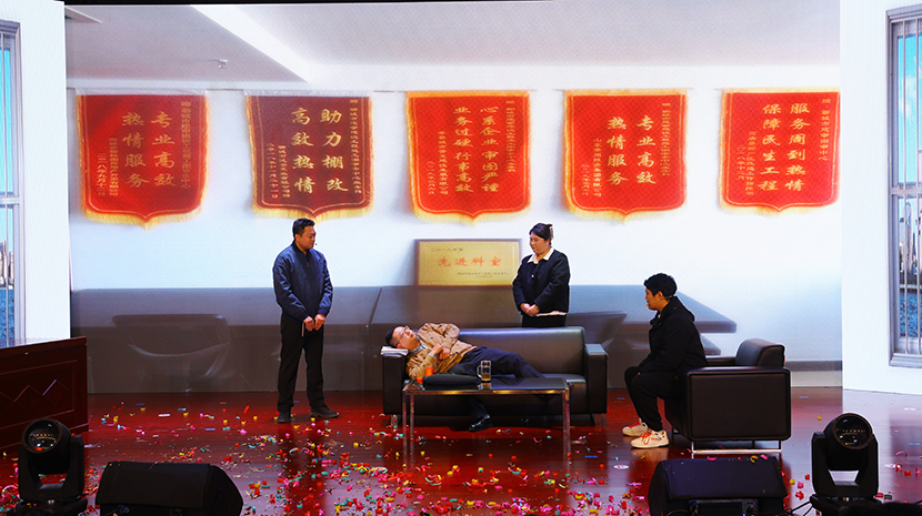 演出在舞蹈《祖國(guó)你好》中拉開序幕,隨后,一個(gè)個(gè)歡快、喜慶、祥和的文藝作品相繼上演。這其中,既有充分展現(xiàn)臺(tái)北發(fā)展力量的情景劇《我們是臺(tái)北力量》《南泥灣暢想》,也有大氣磅礴的男女對(duì)唱《不忘初心》和小合唱《眾人劃槳開大船》,有草原氣息的笛子獨(dú)奏《牧民新歌》,諷刺當(dāng)下“躺平式”干部的廉潔作風(fēng)小品《坑》,展現(xiàn)公司活力的男團(tuán)《舞蹈:串燒》《山丹丹花開紅艷艷》,奇特、神秘的魔術(shù)表演,一腔情懷的京劇《沙家浜-唱段軍民魚水情》……最后,在機(jī)關(guān)全體人員帶來舞蹈《相親相愛的一家人》中落幕,高潮迭起、精彩不斷,得到廣泛好評(píng)。