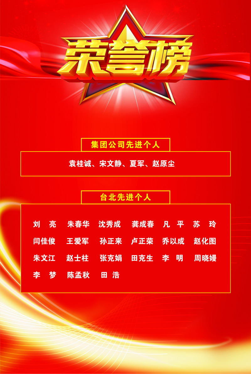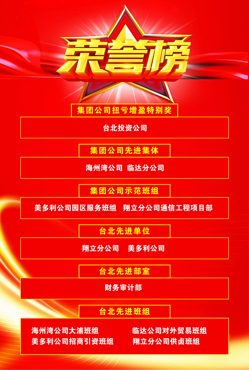 臺(tái)北投資公司連續(xù)兩年被集團(tuán)公司授予“扭虧增盈特別獎(jiǎng)”;海州灣公司、臨達(dá)分公司被評(píng)為先進(jìn)集體;美多利公司園區(qū)服務(wù)班組、翔立分公司通信工程項(xiàng)目部被評(píng)為示范班組;夏軍、趙原塵、袁桂誠(chéng)、宋文靜被評(píng)為優(yōu)秀員工。