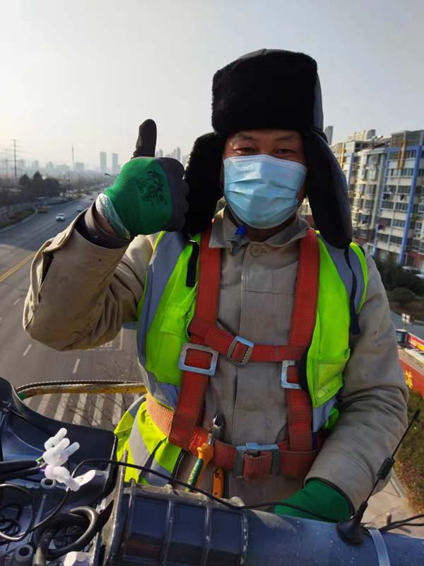 ?該項(xiàng)城市照明提升工程工程量大(約6500套路燈),工期緊。為了趕時(shí)間進(jìn)度,翔立“鐵軍”們由12月27開始施工,日以繼夜、馬不停蹄的連續(xù)奮戰(zhàn)在工程一線,沒有一個(gè)人掉隊(duì),沒人喊苦叫累,個(gè)個(gè)都像鉚足了勁的“小牯牛”。肩帶《安全員》紅袖章的工程負(fù)責(zé)人喬以成騎著電瓶車不時(shí)地在海寧大道上來(lái)回穿梭著,“王師傅,高空作業(yè)車四條支撐臂必須支撐平穩(wěn)牢固后再提升哦”,“段青春,把前方施工的警示牌擺在車輛后面,還有道路安全錐桶一定要將作業(yè)區(qū)域圍起來(lái),與后面來(lái)車方向保持安全距離?!痹谑袇^(qū)人流密集的道路上同時(shí)有5臺(tái)登高作業(yè)車分區(qū)域高空作業(yè)的情況下,他最放心不下,畢竟是高空作業(yè)!為了防止高空墜落,登高施工操作人員全部按要求規(guī)范佩戴安全帶、系好安全繩、絕緣鞋、防寒安全帽、警示馬甲一應(yīng)俱全,武裝整齊。為防高空落物,作業(yè)車吊籃內(nèi)使用的工具全部系上“失手繩”,安全施工是必要的前提,有措施,有辦法,畢竟千條萬(wàn)條,安全才是第一條!