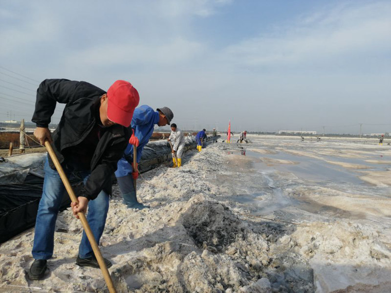 大浦工區(qū)將黨日活動開到了生產(chǎn)一線,在二組灘頭全體黨員面對黨旗重溫了入黨誓詞:“我志愿加入中國共產(chǎn)黨,擁護(hù)黨的綱領(lǐng),遵守黨的章程………”一字一句鏗鏘有力、滿懷激情,進(jìn)一步增強了黨員責(zé)任感和使命感,提高了黨組織的凝聚力和戰(zhàn)斗力。在隨后黨員突擊隊穿好勞動護(hù)具,做好安全措施,立即投入到扒鹽工作中。大家分工合作、協(xié)同配合,在晶瑩剔透的鹽池里盡情的揮灑著汗水。據(jù)悉,本次突擊人工扒鹽,面積230公畝,扒鹽量達(dá)3500噸,可為企業(yè)增收70萬元。