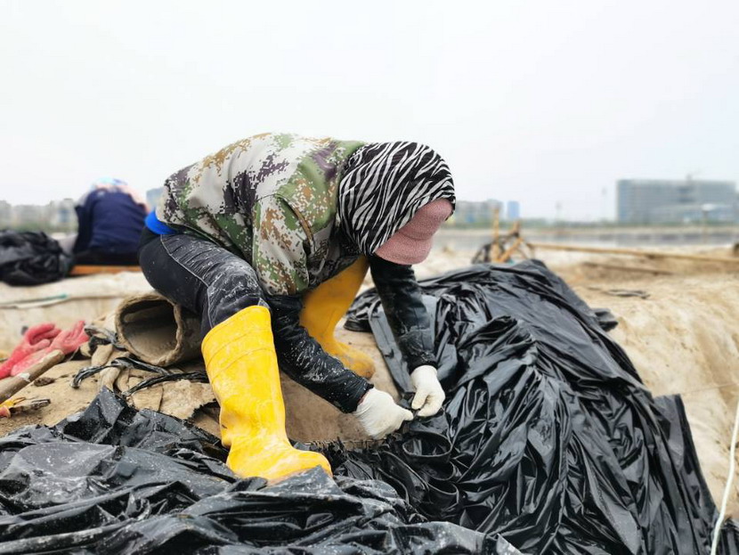 1點(diǎn)10分,在裁判員的鳴哨聲后,各參賽小組立即投入到激烈的比賽中,參賽選手們紛紛拿出自己的看家本領(lǐng),一展身手,可謂真刀真槍拼水平,都立志要在比賽中亮出平時(shí)苦練的絕活,充分展示自己的技藝。各小組成員分工有序,塑布上浮板、壓板條碼放、壓板條釘釘子、塑布上墻固定各環(huán)節(jié)無縫銜接,女工則負(fù)責(zé)將塑布上環(huán),確保塑布拉放的牢固性。看著參賽選手們嫻熟的手法、精湛的技藝、配合的默契,礦鹽生產(chǎn)技術(shù)顧問王緒前作出了高度評(píng)價(jià),他說:“我們臺(tái)北的鹽業(yè)生產(chǎn)者,技術(shù)功底扎實(shí),心理素質(zhì)沉穩(wěn),不愧是千年淮鹽的傳承者,實(shí)在令人欽佩!”