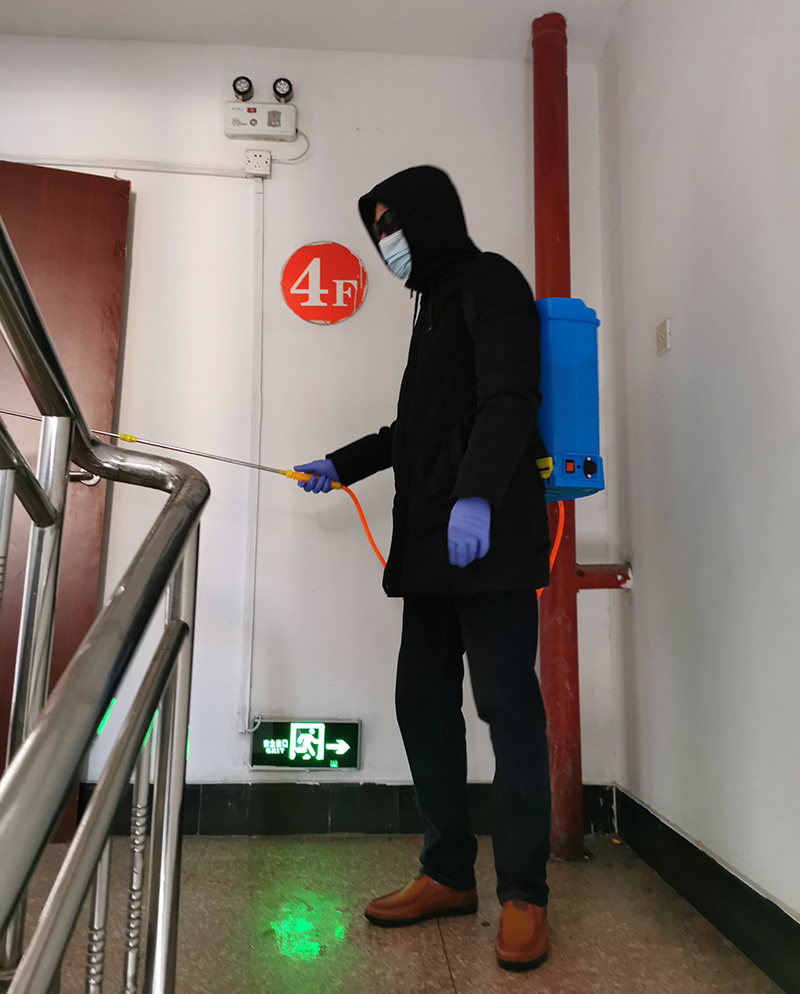 義務(wù)消毒,沒(méi)有報(bào)酬,得隨時(shí)待命,看起來(lái)是應(yīng)者寥寥的苦差。在昌圩湖職工小區(qū)和公司機(jī)關(guān)大樓,卻穿梭著這樣的身影。他們背著裝滿消毒液的噴壺,穿梭在社區(qū)街道和辦公場(chǎng)所,把消毒液噴灑到的每一處。