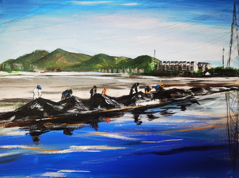 在這個(gè)屬于黨員的節(jié)日,我們脫下華麗的衣裳,全副裝備到達(dá)東灘,男同事們穿上水靴拿起鐵锨下到溝里,溝里淤泥已經(jīng)漫過了腿肚,女同事三五成群撿垃圾,抬浮板……背灼炎天光,力盡不知熱,在火熱的太陽下,我們頂著一身如雨的汗水,只為能在熱火朝天的奮斗中,給彼此一份清涼的懷念。