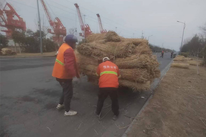 實時拆除防寒設(shè)施。隨著氣溫的逐漸升高,為使苗木更好、更快的返青,前期瑞南二個綠化班組緊鑼密鼓,積極準(zhǔn)備,搶抓時機(jī),3月中旬對云港路、金港路、228等道路兩側(cè)夾竹桃等綠植防寒草簾進(jìn)行拆除工作,并對去冬枯枝干葉安排修剪。