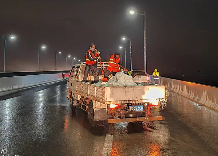 該公司迅速啟動(dòng)突發(fā)天氣應(yīng)急保障預(yù)案,近30余名道路應(yīng)急排險(xiǎn)突擊隊(duì)員,在公司統(tǒng)一按排下 ,裝車備運(yùn)融雪鹽斤近15噸,現(xiàn)場(chǎng)工作中隊(duì)員們士氣高漲,無所畏懼。夜間8時(shí)左右,10余名黨員先鋒,兵分三路再次安全有序奔赴燒香河、海濱大道、228等路段橋梁,無懼大風(fēng)夾著冰雨顆粒吹打臉頰,兩人一對(duì)、三人一組、揮動(dòng)手中鐵銑,汗水與冰雨濕透橙色衣衫,經(jīng)過近4個(gè)多小時(shí)努力奮戰(zhàn),人工撒放融雪鹽斤近20余噸,高質(zhì)高效保障近30座橋梁安全通暢。