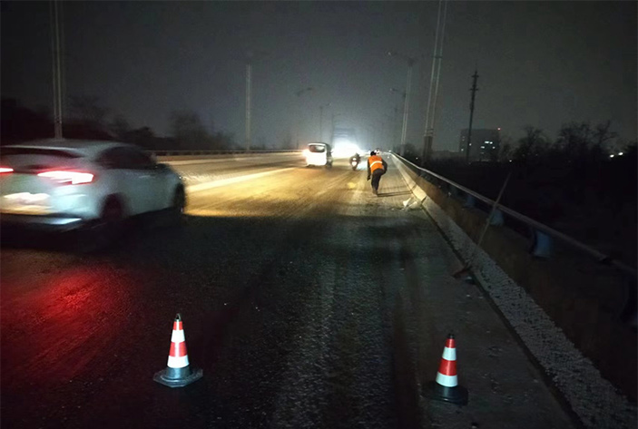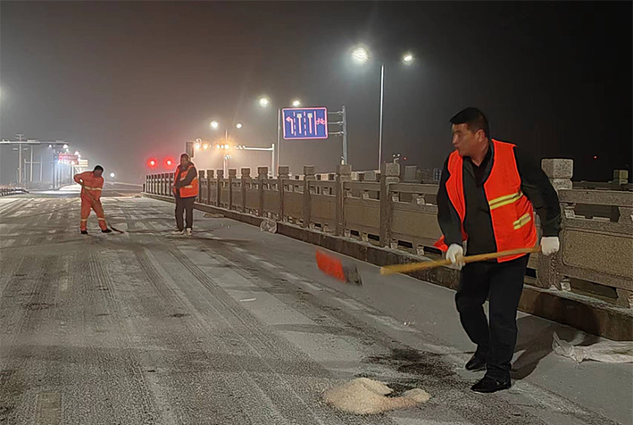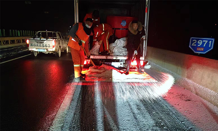 該公司除雪突擊隊由總經(jīng)理徐習(xí)華和副總王利分頭帶隊指揮,集結(jié)了安全部、管養(yǎng)部、綠化、保潔、市政、環(huán)衛(wèi)的突擊隊員80余名,出動5輛皮卡車、3輛皮卡、1臺裝載機和2輛巡查車,主要負(fù)責(zé)新區(qū)內(nèi)橋梁、連云開發(fā)區(qū)橋梁、徐新路、疏港大道、228省道等主要交通干道布撒融雪劑抗凍救災(zāi)工作。突擊隊員在進(jìn)行融雪劑撒布作業(yè)的同時,及時清理路面融化雪水,防止再次結(jié)冰,各除雪設(shè)備配合作業(yè),階梯式向前推進(jìn),提高除雪效率。(李敏 王宜全)