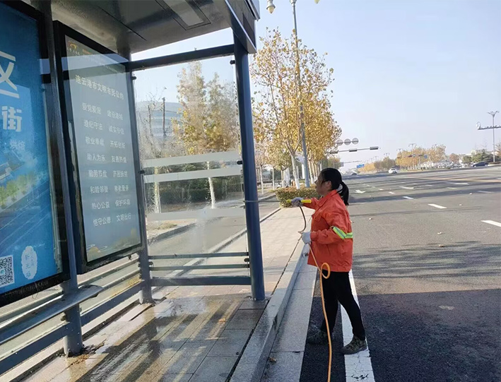 該分公司百余名一線保潔人員,無懼徐圩初冬低溫天氣,道路兩側(cè),公交站臺,三人一組,兩人一對在班長帶動下,揮動手中大掃把,上下擺動拖把,人工清掃輔道落葉2000多米長,清洗站臺30多個,徒手擦洗座椅60多個,清倒果皮箱200多個;突擊轉(zhuǎn)運園區(qū)施工垃圾300袋,有力保障途經(jīng)道路環(huán)境整潔靚麗;大型車輛整裝待發(fā),持續(xù)三天加班加點,7時許準時加滿車廂用水,安全有序到達指定路段,20臺大中型清掃沖洗車輛作業(yè)臺班達4個以上,為成功完成此次大保障有力彰顯機械強大功能。