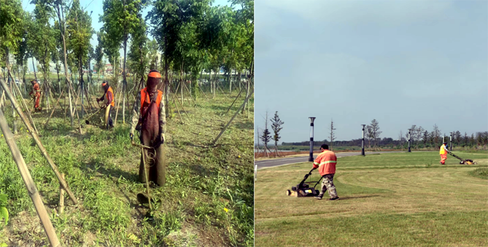 早上6:30,班組兵分三路。班長田恒亮帶領(lǐng)一組工人用草坪機(jī)修理草坪;協(xié)管員葛成東帶另一組工人用割灌機(jī)清除雜草;對(duì)于不便用機(jī)器清除的區(qū)域,第三組工作人員采取用手拔除方法,確保各區(qū)域雜草清理不留死角。
