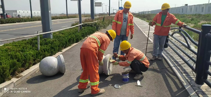 維修班組成員經(jīng)過多日實(shí)地考察,結(jié)合道路現(xiàn)場實(shí)際情況制定了維修計(jì)劃,并對部分道路上擋車樁點(diǎn)位、間距設(shè)置進(jìn)行了合理調(diào)整,來規(guī)避擦碰現(xiàn)象發(fā)生。在石化三路一處施工現(xiàn)場,兩組隊(duì)員頂著炎炎烈日正在非機(jī)動(dòng)車道上進(jìn)行擋車柱安裝工作,他們配合默契,利用開孔鉆、鐵锨等工具開孔、清掏、埋設(shè)樁柱,然后用混凝土填充、壓實(shí)地下部分,最后整平路面。安裝好之后將有效阻止機(jī)動(dòng)車隨意占用人行通道,達(dá)到安全目的。本次施工共安裝維修擋車柱36個(gè)、穩(wěn)固球狀擋車石約180多處。